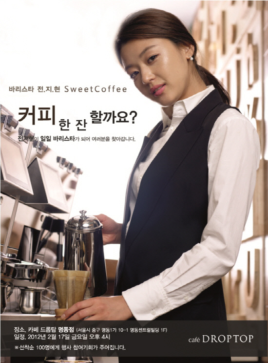 카페 드롭탑(DROPTOP, www.cafedroptop.com)은 오는 17일, 드롭탑 서울 명동점에서 '바리스타 전지현의 Sweet Coffee, "커피 한 잔 할까요"' 고객 이벤트를 진행한다.