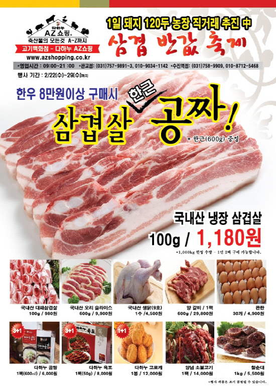 모든 축산물을 전국 최저가로 판매하는 다하누 고기백화점 'AZ쇼핑'(www.azshopping.co.kr 대표 최계경)에서는 국내산 냉장 삼겹살을 최저가로 만나볼 수 있는 '삼겹 반값 대 축제'를 진행한다.