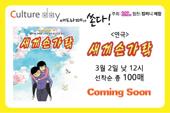 앱디스코(대표 정수환)가 매주 금요일 뮤지컬, 연극, 영화 등 공연 티켓을 선착순 무료로 제공하는 '컬쳐데이'이벤트를 개최한다. 컬쳐데이 이벤트는 최근 앱스토어 소셜네트워킹 무료분야에서 애드라떼가 오랜 기간 상위권을 차지하며 더욱 큰 사랑을 얻게 된 기념으로 이용자들에게 더 많은 문화혜택을 제공하기 위해 마련됐다. 컬쳐데이 이벤트에 참여방법은 매주 낮 12시 애드라떼 애플리케이션에 접속해 참여하기 버튼만 누르면 된다. 첫 번째 컬쳐데이의 막을 열 공연으로는 연극 '새끼손가락'이다. 연극 새끼손가락은 현재도 활발히 연재활동을 하고 있는 이익수 작가의 회당 별점 9.9에 달하는 화제의 네이버 인기 웹툰 '새끼손가락'을 원작으로 한 작품이다. 뮤지컬 위대한캣츠비, 댄서의 순정, 와이키키브라더스, 명성황후에서 열연한 대학로 실력파 배우 최대철, 드라마 시크릿가든, 시티홀, 미남이시네요와 영화 좋은 놈, 나쁜 놈, 이상한 놈에서 열연을 펼쳤던 배우 최대성 등이 참여해 밀도 있는 재미를 보장한다.
