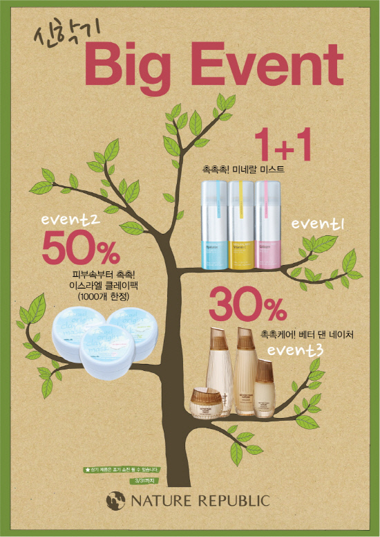 태초 자연의 신비함을 담은 화장품 브랜드 네이처리퍼블릭(대표 정운호)은 신학기가 시작되는 3월을 맞아 한 달간 학생들의 새로운 시작을 응원하는 '신학기 빅 이벤트'를 진행한다고 밝혔다.