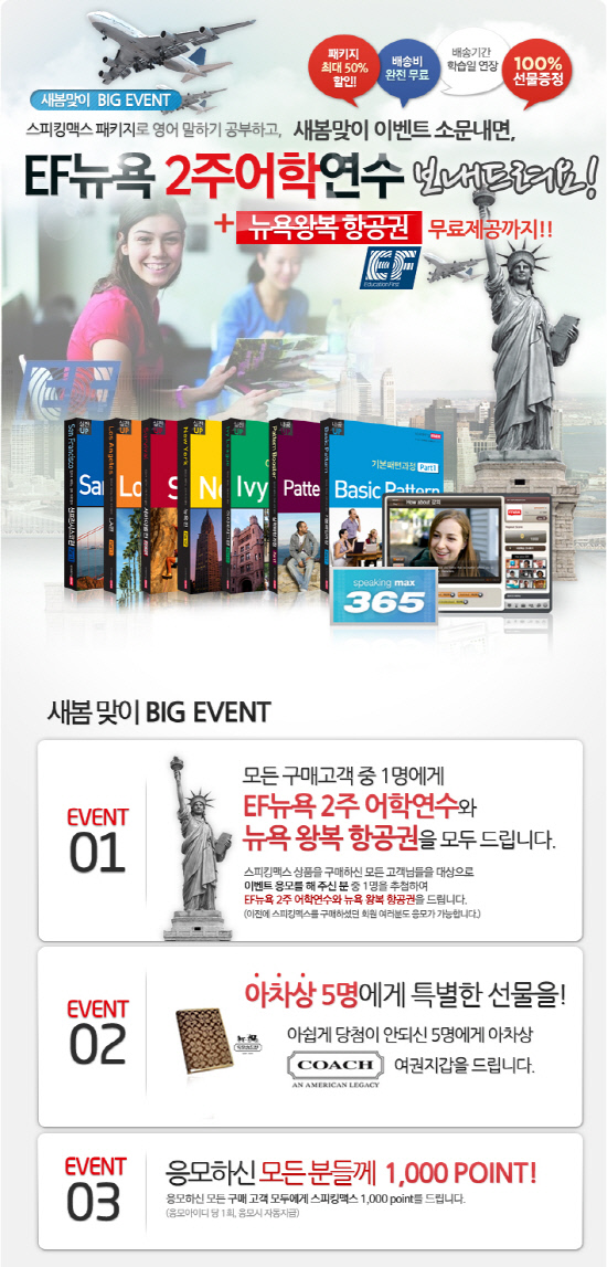 스픽케어(대표 심여린, www.speakcare.com)가 개강 리얼리티 영어학습 프로그램 '스피킹맥스(www.speakingmax.com)'패키지 구매고객 대상으로 뉴욕 단기 어학연수 프로그램, 런던 왕복항공권, 명품 코치여권지갑 등 다양한 경품을 제공한다. 뉴욕 단기 어학연수 이벤트는 EF에듀케이션과 공동으로 진행하는 이벤트로 뉴욕 왕복항공권과 숙소, 어학 프로그램까지 모두 포함돼 있다. 당첨자는 5월~8월 중 원하는 날짜를 선택할 수 있다. 4월 30일까지 스피킹맥스 패키지 상품을 구매 후 홈페이지 이벤트 코너에 댓글을 달면 자동으로 등록된다.