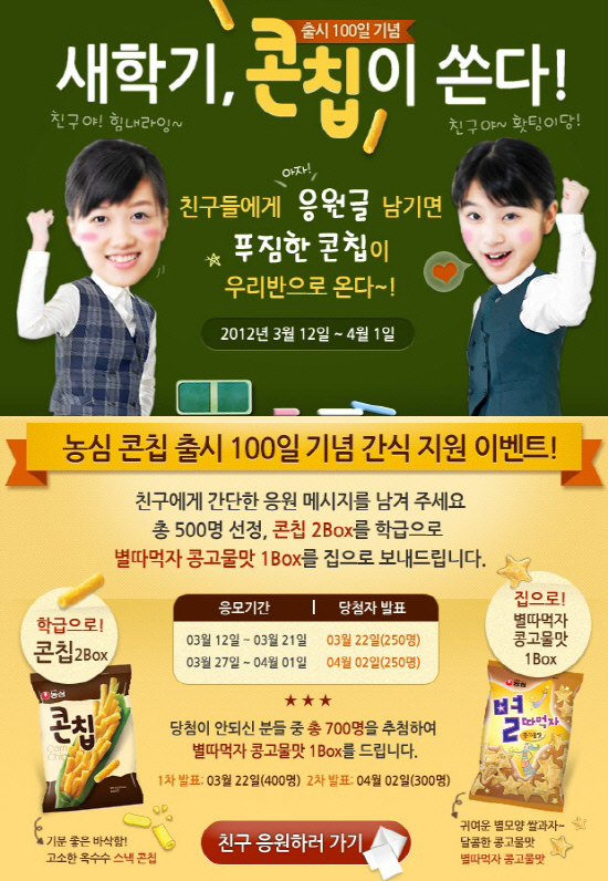 해당 이벤트 페이지를 방문해 "친구야 힘내라!" "친구야 파이팅~" 등의 간단한 새학기 응원 메시지를 올리면 된다. 응원 메시지를 올린 사람 중 500명을 선정해 '콘칩' 2박스와 '별따먹자 콩고물맛' 1박스를 보내준다. 콘칩 2박스는 학급으로 배송되고 별따먹자 콩고물맛 1박스는 집으로 따로 배송되어 학교와 집에서 모두 풍성하게 농심 스낵을 즐길 수 있다. 3월 22일 1차 당첨자 250명이 발표되고, 이벤트가 종료된 다음날인 4월 2일에 2차 당첨자 250명이 이벤트 페이지를 통해 발표된다. 그리고 아쉽게 당첨이 안된 이들을 위해 700명을 추가로 추첨해 별따먹자 콩고물맛 1박스를 증정한다.