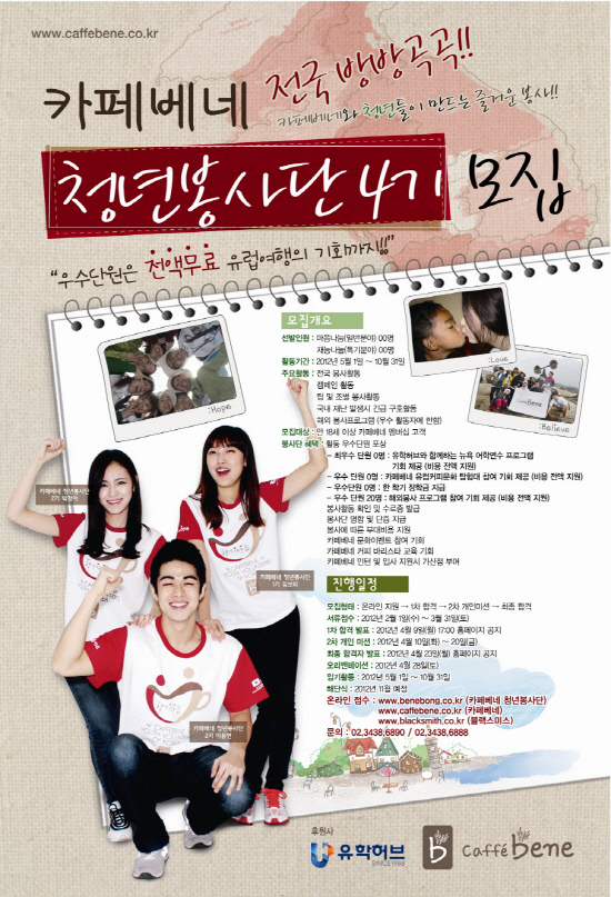 2012년 4기를 맞는 카페베네 청년봉사단은 총 200명이 선정 될 계획이며 만 18세 이상의 카페베네 고객이라면 누구나 응모할 수 있다.
