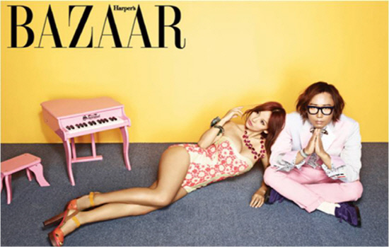 정재형 역시 이효리와 함께한 '하퍼스 바자'의 지면 화보를 통해 지드레곤과 같은 재킷을 착용했다. 정재형은 톰 브라운 재킷에 보타이와 핑크 컬러의 카브라 팬츠를 착용했으며, 여기에 퍼플 컬러의 벨벳 소재의 로퍼로 위트있는 스타일링을 더했다.