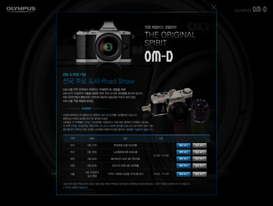 올림푸스한국(대표 방일석)은 플래그십 하이브리드 카메라 'OM-D' 런칭을 기념해 전국 주요 도시에서 제품을 직접 체험해 볼 수 있는 'OM-D 로드쇼(Road show)'를 진행한다. 올림푸스 OM-D 로드쇼 행사는 신제품 OM-D 체험 중심의 프로그램으로, 서울,부산,대구,광주,대전 등 전국 주요 도시에서 진행된다.