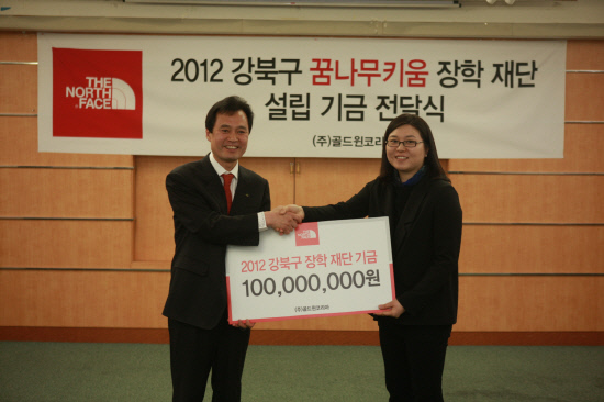 이날 강북구청에서 노스페이스 마케팅본부 성가은 이사와 강북구청 박겸수 구청장 등이 참석한 가운데 재단 설립 기금 1억 원 전달식을 가졌다.
