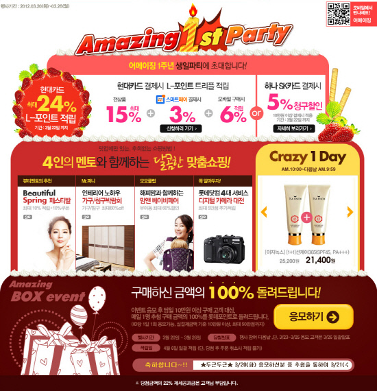 작년 3월 롯데닷컴에서 첫 선을 보인 '어메이징' 행사는 말 그대로 깜짝 놀랄만한 혜택을 제공하면서 화제를 모았다. 이번엔 1주년 생일을 맞아 매일 1명에게 구매금액을 고스란히 돌려주는 파격 이벤트를 진행한다. 당첨자는 전날 구매자를 대상으로 다음날 발표하며, 하루 한번씩 매일 응모 가능하다.