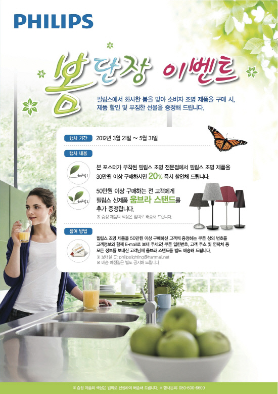 필립스전자(대표 김태영)는 새봄을 맞아 집안 인테리어를 산뜻하게 바꿀 수 있도록 필립스 조명 제품 할인 및 사은품 증정 이벤트를 5월 말까지 실시한다. 필립스 봄단장 이벤트 포스터가 부착된 전국의 30여개 필립스 조명 매장에서 진행되며 필립스 조명제품을 30만원 이상 구매하는 고객에게 총 금액의 20%를 할인해 주고, 50만원 이상 구매 고객에게는 할인혜택과 함께 고급 인테리어 조명인 룸스타일러 움브라(roomstylers Umbra) 조명 한 세트를 추가로 증정한다.