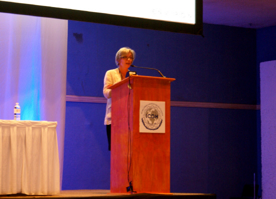 | align='left" bgcolor='#ffffff" class='caption'>인바이론의 린다 델 책임연구원이 ICOH학회에서 삼성전자의 근무환경에 대한 연구결과를 발표하고 있다. |