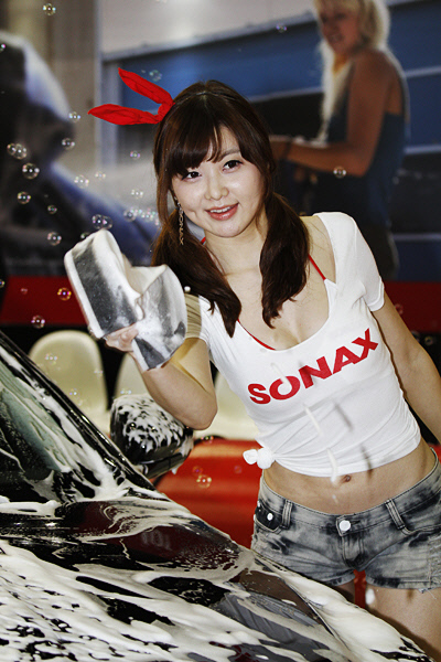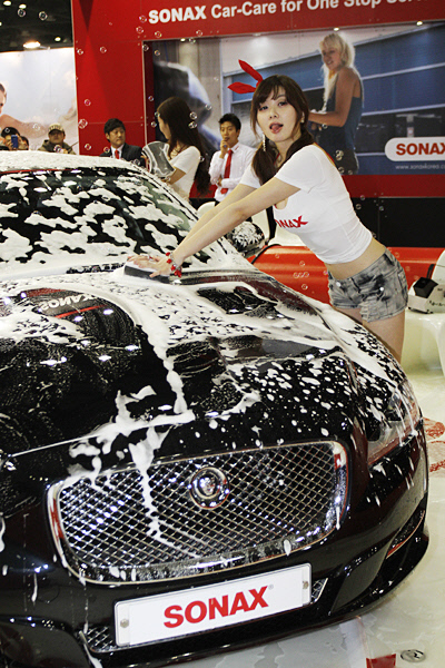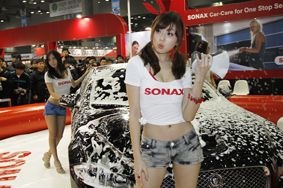 24일 경기도 고양시 일산 킨텍스에서 열린 '2012 오토모티브위크(Automotive Week 2012) 튜닝쇼'에서 프리미엄 차량관리 전문용품 브랜드인 소낙스(SONAX) 모델 한지은 정세온 이지민 3인방이 소낙스 부스내에 마련된 특별관 안에서 세차쇼를 하고 있다.