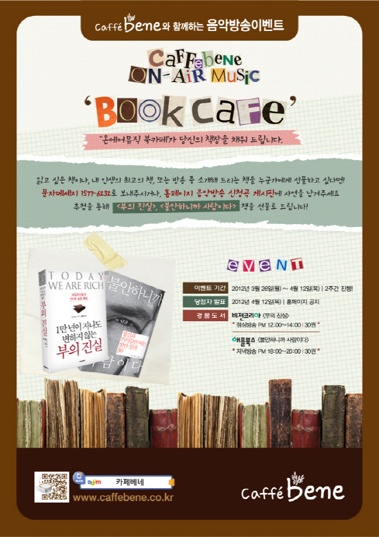 증정될 책은 <부의 진실> 과 <불안하니까 사람이다> 각 30권씩. 참여를 원하는 고객은 문자 메시지 1577-6232로 사연을 보내거나, 카페베네 홈페이지(www.caffebene.co.kr) 음악방송 신청곡 게시판에 사연을 남기면 된다. 금번 이벤트는 4월 12일(목)까지 2주간 진행되며, 이벤트 당첨자는 카페베네 홈페이지를 통해 확인할 수 있다.