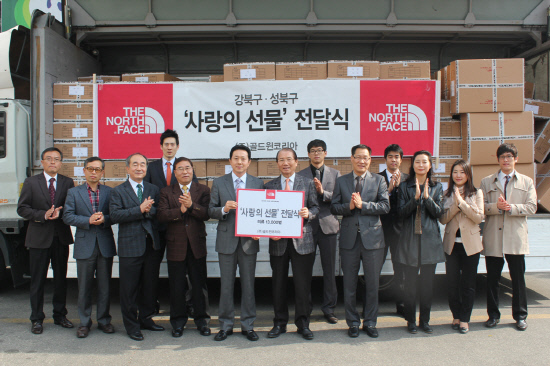 | ◇29일 강북구청에서 골드윈코리아 허호기 감사와 노스페이스 임직원들이 강북구청에 지역 소외주민을 돕기 위한 사랑의 선물을 전달했다 |