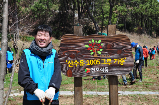 천호식품 김영식 회장과 임직원 400여 명은 식목일을 맞아 자연사랑의 이념을 실천하고자 서울 청계산과 부산 남구 백운포 인근에서 각각 꽃씨 나눠주기와 산수유나무심기 행사를 진행했다.