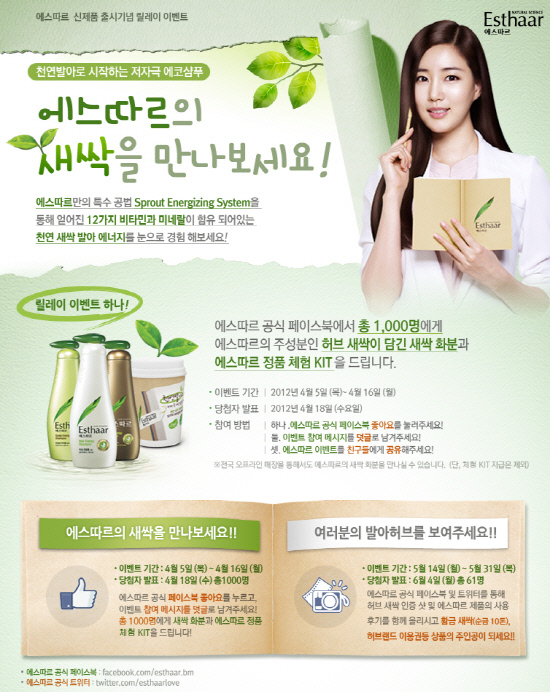 온라인은 새롭게 오픈한 에스따르 페이스북(www.facebook.com/Esthaar.BM)을 통해 진행된다. 4월16일까지 페이스북 이벤트 페이지에 덧글을 통해 참여신청 메시지를 남기고 '페이지 공유하기'를 하면 자동응모되며, 추첨을 통해 1000명에게 허브화분과 신제품 트리트먼트 샘플을 증정한다. 당첨자는 4월18일 개별 공지된다.