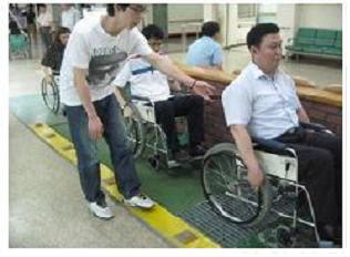 ◇국민연금공단(이사장 전광우) 임직원들이 국립재활원에서 눈높이 장애인 복지서비스 제공을 위해 휠체어 이동과 시각 장애체험을 하고 있다.