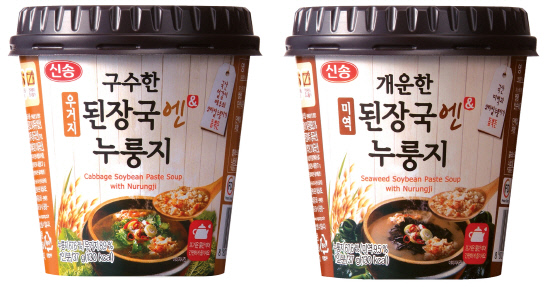 신송식품의 신제품인 된장국 엔 누룽지 2종은 국산 얼갈이 배추가 듬뿍든 '구수한 우거지 된장국 엔 누룽지'와 국산 미역이 듬뿍 들어있는 '개운한 미역 된장국 엔 누룽지' 이렇게 2가지 맛으로 구성했다. 신송식품의 된장국 엔 누룽지 2종은 신송식품의 '재래된장'으로 만든 된장국과 '100% 우리쌀'을 사용한 누룽지로 맛의 깊이를 더하였다.