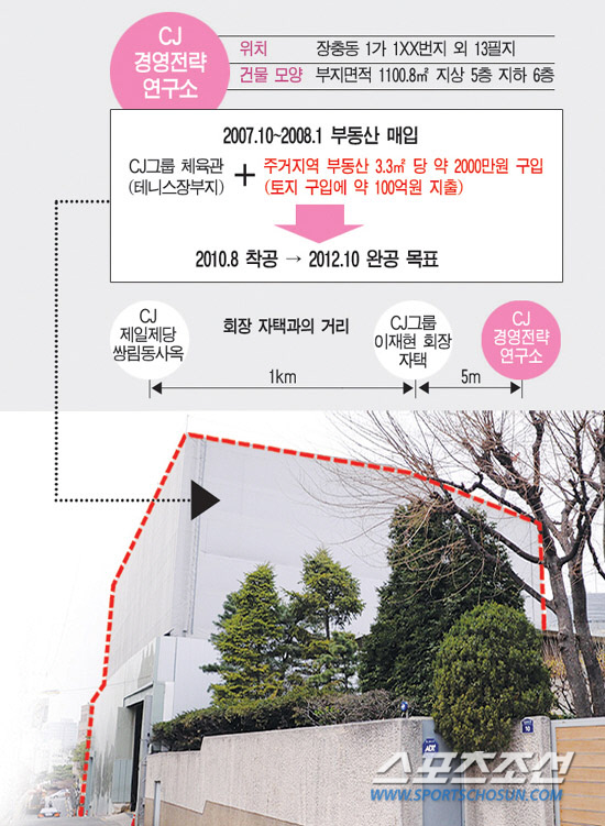CJ제일제당은 CJ경영전략연구소(이하 연구소) 설립을 위해 2007년 10월부터 2008년 1월까지 이 일대 부동산을 사들이기 시작했다. 경영전략연구소가 들어설 위치는 장충동 1가 13필지. 당시 CJ그룹체육관(테니스장 부지)에 더해 주거지역 부동산을 3.3㎡당 약 2000만원에 땅을 구입한 것으로 알려진다. 땅구입에 들어간 돈은 어림잡아 100억원을 웃돈다.