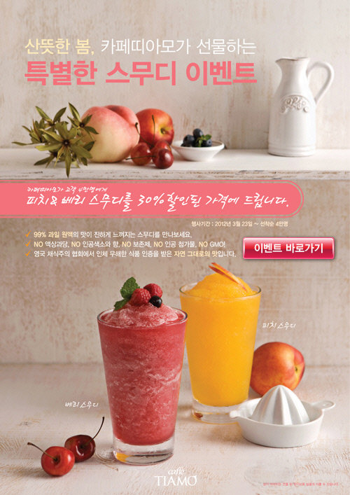 카페띠아모의 피치&베리 스무디는 과일 원액 99%에 얼음만 갈아 넣은 고급 천연 과일 스무디 제품이다. 일체의 액상과당, 인공색소와 향, 보존제, 첨가물, GMO(유전자 조작 생물) 등이 들어있지 않다. 영국의 채식주의협회도 인체에 무해한 식품이라는 인증을 받았다.