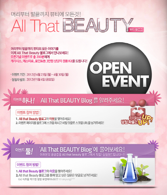 애경의 뷰티 브랜드 통합블로그 '올댓뷰티'는 오픈을 기념해 케라시스, 에스따르, 포인트 등 3개 브랜드의 정품을 증정하는 이벤트를 진행한다. 오는 30일까지 '올댓뷰티' 블로그에서 '서로 이웃 신청'을 한 뒤 이벤트 페이지를 스크랩한 URL과 평소 궁금했던 뷰티 궁금증을 댓글로 남기면 200명을 뽑아 3만원 상당의 케라시스, 에스따르, 포인트 정품키트를 증정한다. 당첨자는 5월4일 발표되며, 이벤트에 응모된 질문은 선별하여 향후 블로그 내의 '소소한 실험실'을 통해 직접 실험할 예정이다.