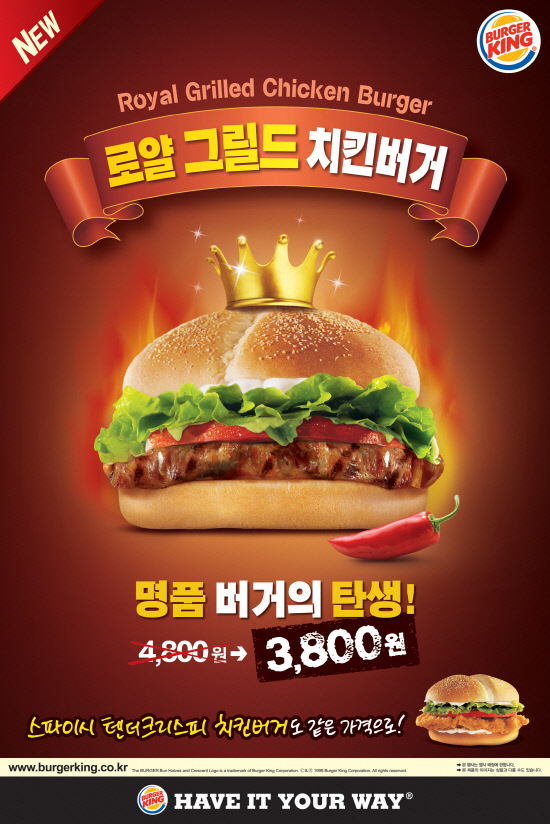 '로얄 그릴드 치킨 버거'는 두툼하고 부드러운 닭 다리살을 불에 직접 구워 기름기를 쪽 뺀 패티에 매콤한 양념과 양상추, 토마토 등 신선한 재료가 어우러진 버거로 한국인의 입맛에 맞는 매콤한 소스와 그릴에 구운 치킨이 느끼함을 없애 담백하고 깔끔한 맛을 자랑한다.
