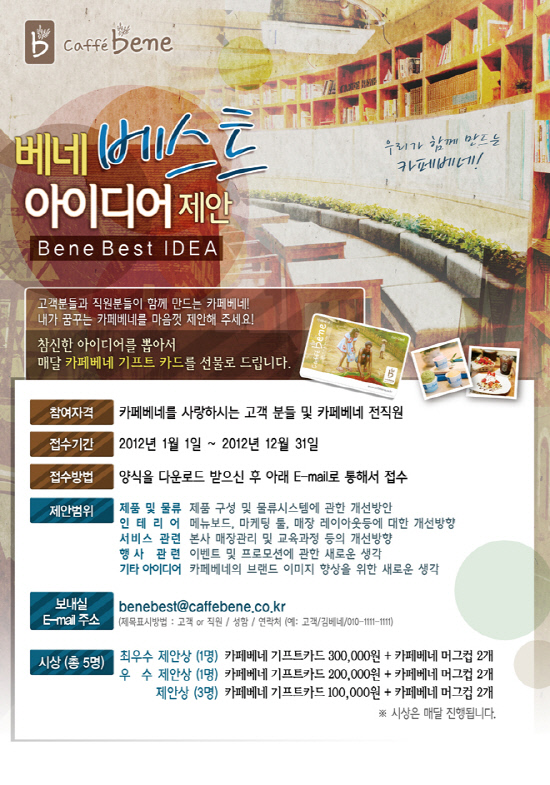 복합문화공간을 추구하는 ㈜카페베네(대표 김선권)가 '베네베스트 아이디어 제안'을 통해 고객과 직원들의 아이디어를 신제품 및 서비스 개선에 적극 반영하고 있다.