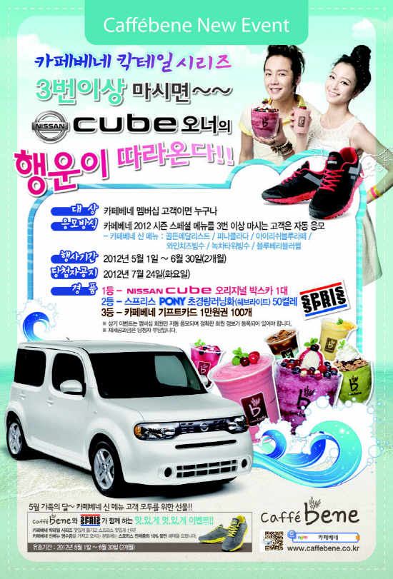 선물도 푸짐하다. 1등은 니산 큐브 오리지널 박스카 1대를 증정할 예정이며, 2등은 스프리스 PONY 초경량 러닝화 50켤레, 그리고 3등에게는 카페베네 기프트카드 1만원권 100개를 증정할 예정이다.