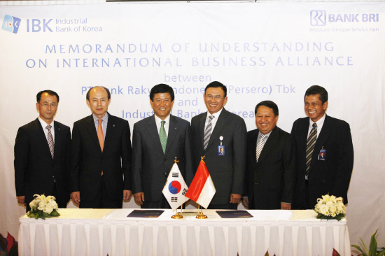 IBK기업은행(은행장 조준희)이 지난 1일 인도네시아 자카르타에 위치한 BRI(Bank Rakyat Indonesia)은행 본점에서 인도네시아 2대 국영은행 BRI와 포괄적 업무협약(MOU)을 체결했다. MOU 내용은 현지진출기업 대출지원 인도네시아 근로자 송금관련 외환사업 협력 강화 BRI에 IBK 현지인력파견 등이다. 조준희 기업은행장(왼쪽 세 번째)과 아흐마드 바히꾸니 BRI 재무총괄이사(왼쪽 네 번째)가 기념촬영에 응하고 있다. 사진 제공=IBK기업은행