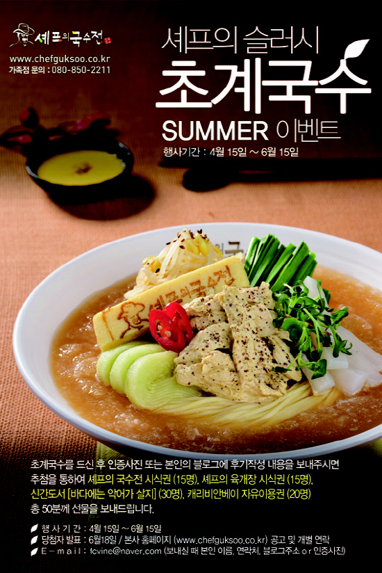 6월15일까지 전국 매장에서 초계국수를 먹고 인증사진 또는 블로그에 후기를 올리면 추첨을 통해 선물을 증정하는 이벤트를 실시한다. 셰프의 국수전 시식권(15명), 셰프의 육개장 시식권(15명), 신간도서;바다에는 악어가 살지(30명), 캐리비안베이 자유이용권(20명) 등이다.
