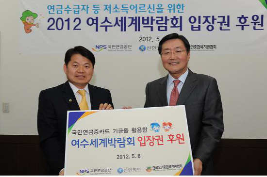 국민연금공단(이사장 전광우)은 어버이날을 맞아 국민연금증카드 기금으로 여수세계박람회 입장권을 구매해 국민연금 수급자 등 저소득 어르신께 전달했다.