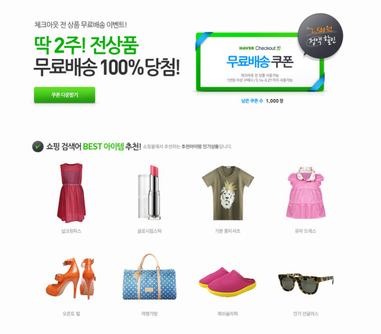 이벤트는 체크아웃 전 회원을 대상으로 진행되는 프로모션으로 체크아웃 회원당 1회에 한해 무료배송 혜택을 받을 수 있으며, 네이버 검색창 또는 네이버 지식쇼핑 검색창에서 '체크아웃 무료배송'으로 검색하거나 네이버 지식쇼핑 (http://shopping.naver.com/쓋rm=ct) 메인 페이지 상단 배너에서 확인 할 수 있다.