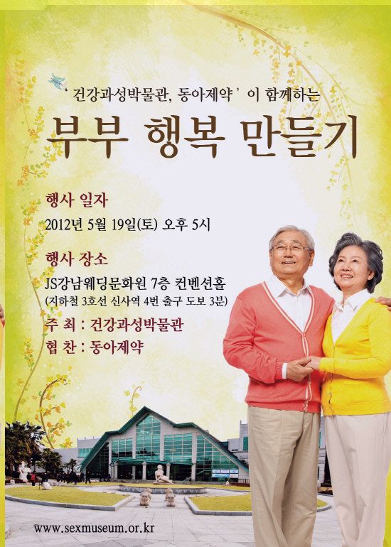 특히 인생의 황혼을 맞이한 노년 부부에게 둘 만의 행복은 이미 먼 옛날의 추억으로 남아있을 것이다. 그래서 이번 부부의 날을 맞아 건강과성박물관에서는 동아제약과 공동으로 노년 부부들을 위한 '부부 행복 만들기'를 준비한다.