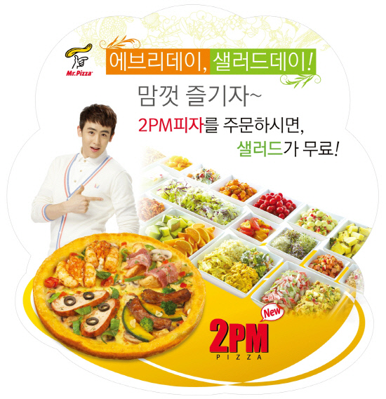 MPK그룹의 미스터피자(대표이사 사장 이주복, www.mrpizza.co.kr)는 신제품 '2PM피자' 주문 시, 주말이나 공휴일 상관없이 샐러드바 2인 무료 제공 프로모션을 오는 6월 3일까지 진행한다.