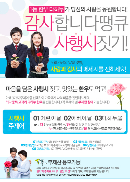 한우전문쇼핑몰 다하누몰(www.dahanoomall.com, 대표 최계경)에서는 가정의 달이자 감사의 달인 5월을 맞아 '마음을 담은 사행시 짓고, 맛있는 한우도 먹고!' 이벤트를 준비했다.