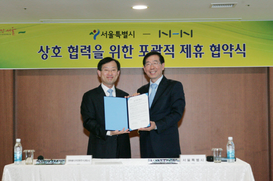 NHN㈜(대표이사 사장 김상헌)과 서울시(시장 박원순)는 14일 서울시청에서 '서울시-NHN 간 상호협력을 위한 포괄적 제휴협약'을 체결했다.