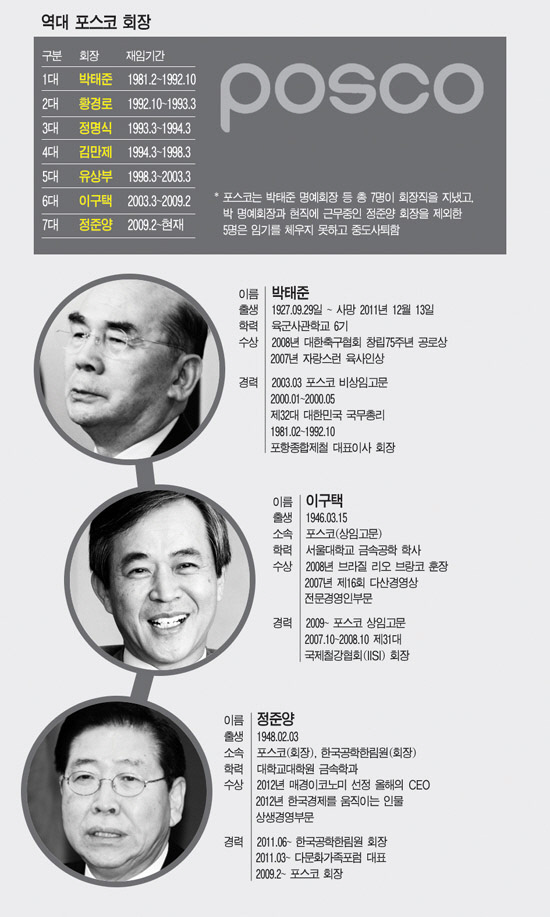 포스코는 국내 최고 철강사다. 철강 경쟁력은 세계 1위. 차세대 제철기술인 파이넥스 기술을 확보하며 글로벌 최고 철강사로 자리매김하는 중이다. 세계적 철강 전문 분석기관인 WSD(World Steel Dynamics)는 2010년에 이어 지난해 6월 2년 연속 포스코를 세계에서 가장 경쟁력 있는 철강사로 선정했다. 세계 34개 철강사를 대상으로 기술력, 수익성, 원가절감, 재무건전성, 원료 확보 등을 평가한 결과다. 포스코의 성장 중심엔 정준양 회장이 자리 잡고 있다. 제철소 현장소장, 생산기술부문 대표를 지낸 현장형 CEO답게 첨단 기술 개발에 투자를 아끼지 않은 결과다. 올 초까지만 해도 정 회장에 대한 평가는 극찬에 가까웠다.