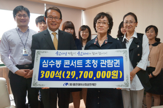 좋은데이사회공헌재단(이사장 최재호)은 가정의 달을 맞아 오는 '심수봉 심포니 오케스트라 콘서트' 부산 공연에 소외계층 어르신을 무료 초청하기로 하고 부산시 노인종합복지관협회에 약 3천만원 상당의 초청 관람권을 증정했다.