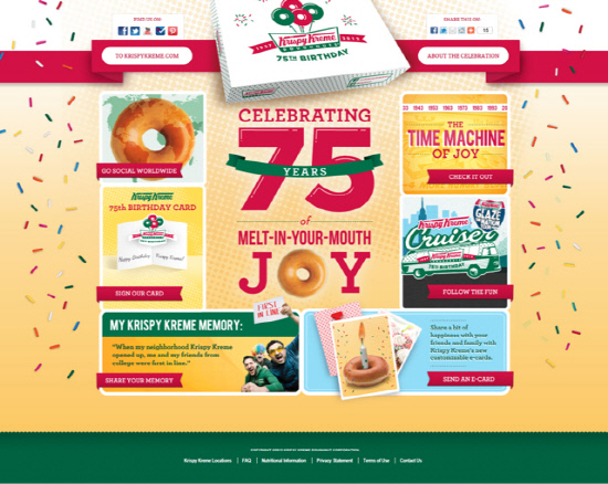 크리스피 크림 도넛 브랜드가 75번째 생일을 맞았다. 크리스피 크림은 세계의 크리스피 크림 팬들과 함께하기 위해 '75주년 기념 마이크로 사이트(www.CelebrateKrispyKreme.com)'를 오픈, 인기를 끌고 있다. 마이크로 사이트에선 크리스피 크림의 생일 축하 메시지 보내기, 크리스피 크림 타임 머신, 크리스피 크림과 함께한 달콤한 사연 보내기 등이 가능하다. 크리스피 크림 도넛 마케팅팀장 드웨인 챔버(Dwayne Chambers)는 "크리스피 크림 도넛의 생일은크리스피 크림의 달콤한 도넛과 깊은 맛과 향의 커피를 기념하는 것은 물론, 크리스피 크림이 지금까지 어떻게 고객들과 소통하고 달콤함과 행복을 선사했는지 다시 한 번 돌아보고자 하는 것"이라며, "이번 기념 행사는 크리스피 크림의 달콤함으로 행복해하는 전 세계 21개국의 수많은 크리스피 크림 팬들과 함께해 더욱 의미가 깊다"고 말했다.