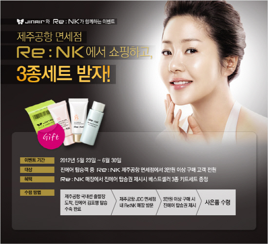 진에어가 6월 30일(토)까지 제주발 국내선 탑승객 중 제주공항 JDC 면세점 내 리엔케이(Re:NK) 매장에서 3만원 이상 구매 고객 전원에게 화장품 3종 키트를 증정하는 행사를 갖는다. 경품 수령을 위해 해당 매장에서 결제시 진에어 탑승권을 제시하면 되며 리엔케이의 베스트셀러 제품인 비비크림, 썬크림, 클렌징리퀴드의 3종 키트를 증정받을 수 있다. 화장품 브랜드 리엔케이는 고현정이 개발에 참여한 화장품으로 알려져 있으며 백화점이나 방문판매를 통해 판매되고 있다.