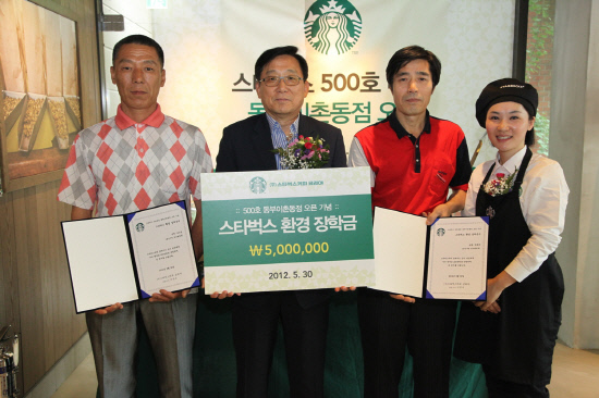 ◇스타벅스커피 코리아는 5월 30일 오픈한 스타벅스 500호점 동부이촌동점에서 용산구청 환경미화원 대학생 자녀를 위한 환경장학금 전달식을 가졌다. 사진 제공=스타벅스 코리아