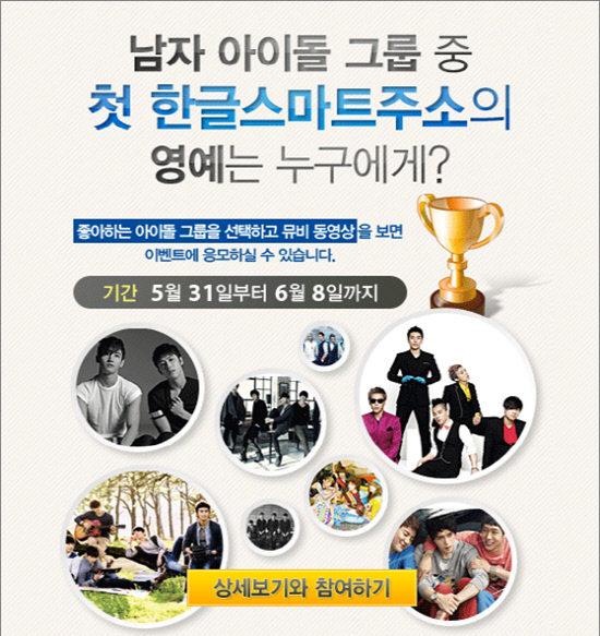 한글스마트주소원(http://한글스마트.주소원)이 6월 8일 까지 첫 한글스마트 주소를 부여 받게 될 남자 그룹을 선정하는 콘테스트를 갖는다.
