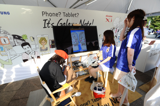 3일 일본 사이타마 스타디움에서 열린 '2014 월드컵 아시아 지역 최종 예선'에서 모바일과 반도체 부문 공식 후원사인 삼성전자가 스타디움 내에 '삼성 갤럭시노트 스튜디오'를 마련, 축구팬에게 캐리커쳐 선물하고 있다.