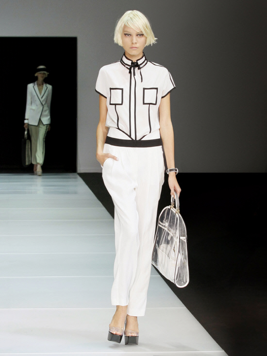 최근 컬렉션에서 해외모델은 똑같은 화이트 블라우스를 착용했지만, 화이트 팬츠를 매치했다.