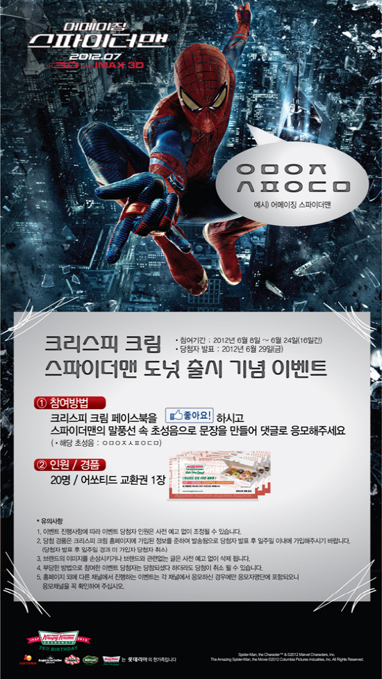 스파이더맨4 영화와 함께하는 만큼 SNS에 고객의 상상력을 자극하는 이벤트를 마련했다. 크리스피 크림 도넛 페이스북(www.facebook.com/kkdkorea1937)을 통해서 신제품 '어메이징 스파이더맨'의 초성음으로 문장 만들기 이벤트를 진행한다. 띄어쓰기에 상관 없이 'ㅇㅁㅇㅈㅅㅍㅇㄷㅁ' 9가지 초성으로 기발하거나 유머 넘치는 문장을 만든 참여자 20명에게 어소티드 더즌 교환권 1매를 선물한다.