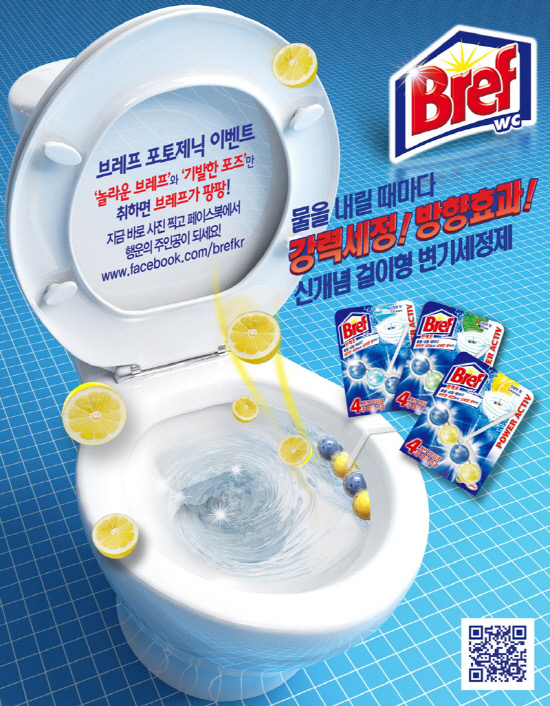 헨켈홈케어코리아(www.henkelhomecare.co.kr)는 신개념 걸이형 변기세정제 '브레프 파워액티브(Bref Power Activ)' 출시를 기념해 이마트 매장 바닥에 설치된 변기 모양의 독특한 '브레프 3D 스티커'와 함께 기발한 사진을 찍기만 하면 브레프 파워 액티브를 무료로 체험할 수 있는 '브레프 포토제닉 이벤트'를 실시한다.