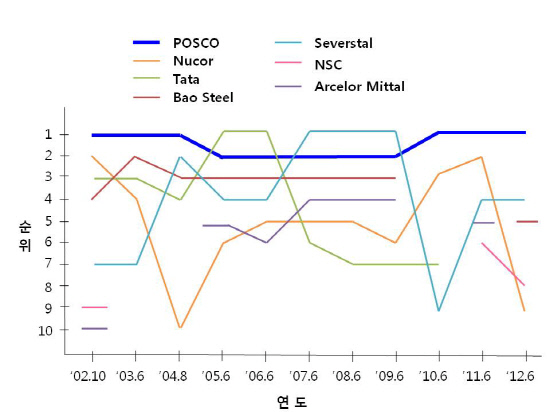 포스코는 2002년부터 2004년까지 1위를 고수하다 철광석 광산을 보유한 세베르스탈, 타타스틸 등 러시아, 인도 철강사들에게 1위 자리를 내주었다. 하지만 2010년 지속적인 원가절감과 수익성 개선, 기술력 향상, 철광석 광산 확보 노력 등을 통해 6년만에 다시 정상에 오른 이후 3년 연속 1위에 오르는 쾌거를 엮어냈다.