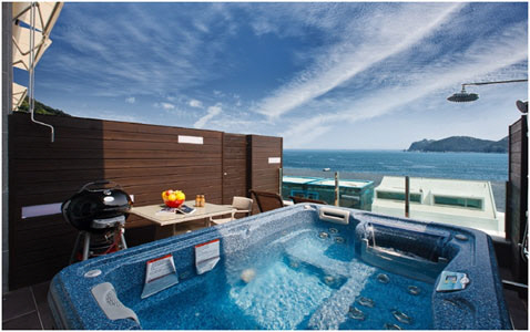 풀빌라형 테라스하우스 구조에 노천에서 즐기는 스파와 썬베드, 바비큐와 야외테라스에서 식사까지 모든 편의시설을 객실 내에서 개별적으로 오붓이 이용이 가능하다. 그동안 펜션에서 비가 오면 속수무책이었던 파라솔에서 과감히 탈피, 어닝시스템을 테라스에 도입해 햇빛과 우천 시에 어닝시스템이 펼쳐져 편안한 휴식을 제공함은 물론 사생활까지 완벽하게 보호한다. 거제도 펜션에 대한 문의와 예약은 홈페이지에서 가능하다.