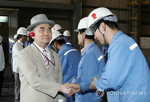 | 고 박태준 포스코 명예회장이 철강 명예의 전당에 올랐다. 1927년생으로 향년 84세. 사진은 지난 2007년 8월 포항제철소 파이넥스 공장을 둘러보고 관계자들을 격려하는 박태준 |