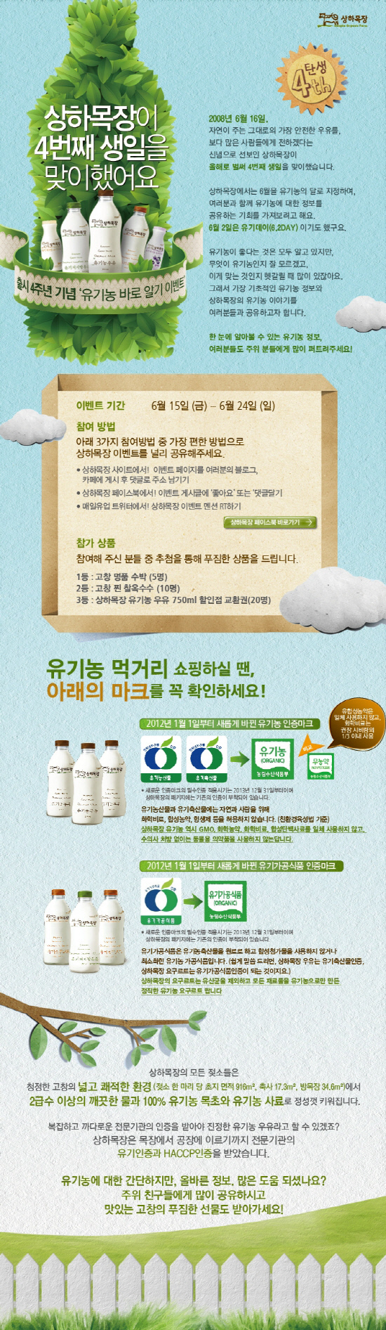 이번 '유기농 바로 알기' 온라인 이벤트는 소비자들에게 유기농 식품을 확인하는 방법에 대한 기초 정보를 제공하고 상하목장이 실천하고 있는 정직한 유기농에 대해 알리고자 기획되었다. 상하목장은 이벤트 페이지를 통해 소비자들이 좀 더 쉽게 유기농 먹거리를 확인할 수 있도록 농림부가 기존 9개 마크를 통일해 만든 새 유기농 인증마크를 자세히 소개하고 유기농 우유 인증과정도 설명한다. 상하목장은 국내 대표 유기농 우유 브랜드로서 엄격한 유기농 인증 기준에 따라GMO, 화학농약, 화학비료, 합성단백사료를 일체 사용하지 않고 유기농법으로 우유와 요구르트 제품을 생산하고 있다.