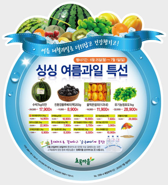 이번 행사는 수박, 블루베리, 참외, 포도, 토마토, 키위, 감귤, 메론 등 총 17가지 친환경 유기농 과일을 최대 23%까지 할인 판매한다. 이번 행사의 특징은 여름철 지치기 쉬운 체력을 필수 영양소와 수분이 풍부한 제철과일로 보양하자는데 있다.