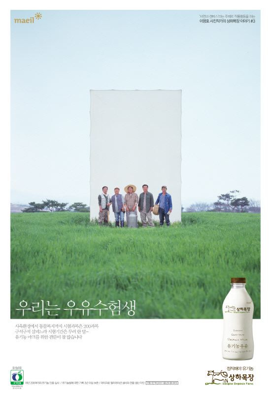 상하목장 인쇄광고는 유기농 우유를 만들어내기 위해 얼마나 많은 노력이 필요한지에 대한 이야기를 세 가지 버전으로 풀어냈다.